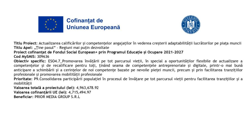Avem plăcerea să vă invităm la conferința de lansare a proiectului „Actualizarea calificărilor și competențelor angajaților în vederea creșterii adaptabilității lucrătorilor pe piața muncii”, Cod MySMIS 309636, proiect cofinanțat din Fondul Social European+, Programul Educație și Ocupare 2021–2027, Prioritate P9.Consolidarea participării populației în procesul de învățare pe tot parcursul vieții pentru facilitarea tranzițiilor și a mobilității, Obiectiv specific ESO4.7_Promovarea învățării pe tot parcursul vieții, în special a oportunităților flexibile de actualizare a competențelor și de recalificare pentru toți, ținând seama de competențele antreprenoriale și digitale, printr-o mai bună anticipare a schimbării și a cerințelor de noi competențe bazate pe nevoile pieței muncii, precum și prin facilitarea tranzițiilor profesionale și promovarea mobilității profesionale.